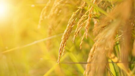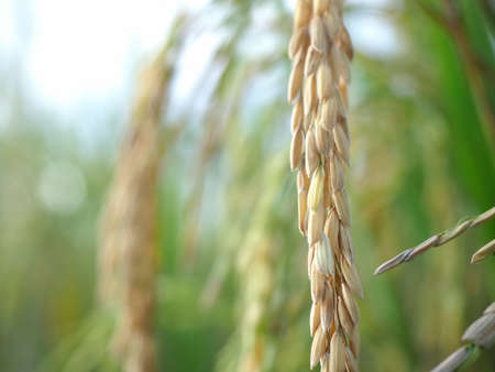 Rice field, close up yellow rice seed ripe on nature background. soft focus rice seeds, copy space
