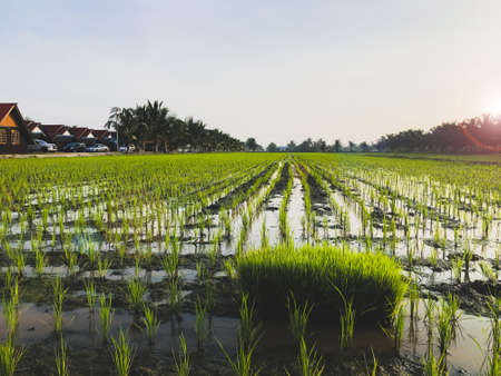 A green young seedling of rice in the field Waiting for the harvest, Nature background