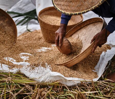 Hands of an old man collects grain of ripe rice in field. Close-up. A common practice done in rural China, Vietnam, Thailand, Myanmar, Philippines.