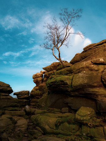 View up on crooked tree with lots of branches on stony slope in Peak District, England.