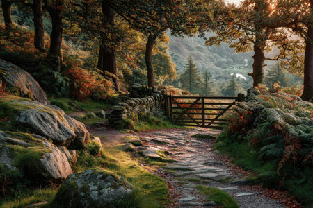 A tranquil forest trail bordered by rustic stone walls and a wooden gate, illuminated by warm sunset hues, evoking peaceful outdoor exploration.