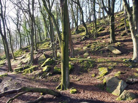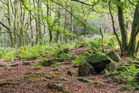 Padley gorge millstone and beech tree in early autumn. Millstone grit rocks covered in moss in a wooded valley with some fallen autumn leaves.