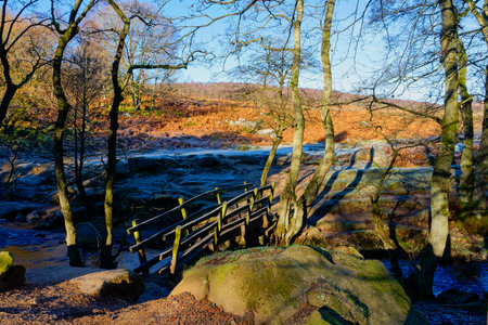 A simple wooden bridge crosses Burbage Brook in Padley Gorge on a frosty autumn morning.
