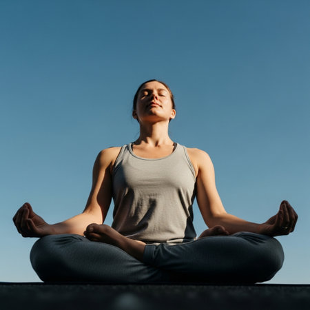 Low angle cinematic shot of a person meditating peacefully in a yoga pose outdoors under harsh sunli