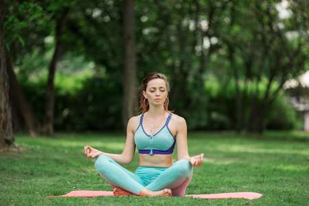 Athletic young woman in sportswear sitting with eyes closed and practicing yoga on green lawn in the park.