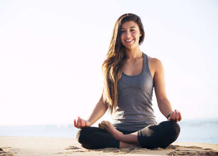 Finding her center. Full length shot of an attractive young woman meditating on the beach.