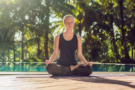 Beautiful young happy woman doing yoga exercise near swimming pool