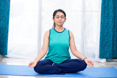 Young healthy beautiful woman practicing yoga at home sitting in lotus pose on yoga mat meditating relaxed. Indoor and outdoor workout. Sport and healthy active lifestyle concept.
