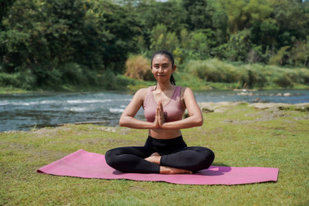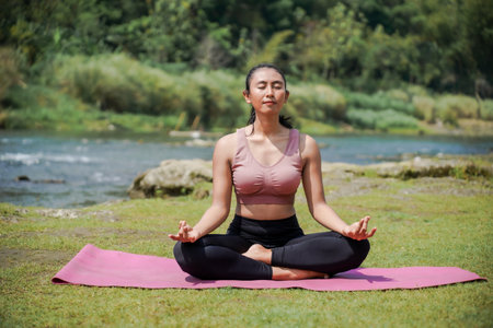 Mental and physical health. A slender, tanned Asian woman in sportswear practices yoga by a tranquil river in the morning. The woman is in the Sukhasana pose, a meditation pose.