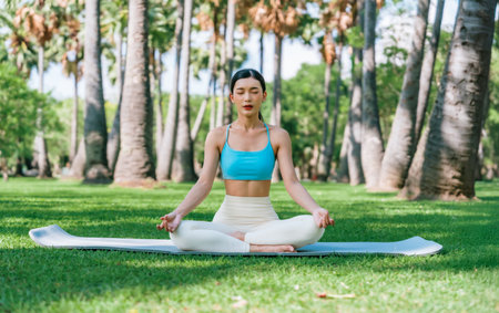 Asian woman meditating in a peaceful park setting, sitting cross-legged on green grass with trees in the background on a sunny day. Concept of mindfulness, self-care, and outdoor relaxation