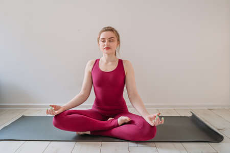 Young caucasian girl dressed in sportswear is doing yoga in the floor sitting with crossed legs and closed eyes