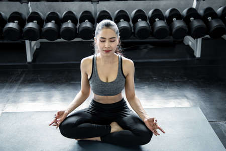 Sexy asian woman playing yoga in the gym. Concept of exercise in gym. Woman workout yoga on mat.