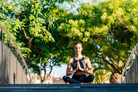 Girl in sportswear sitting in lotus position. Urban yoga