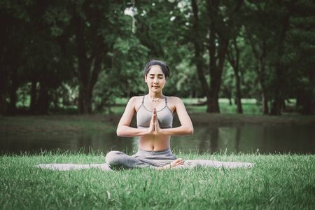 Fitness asian woman doing yoga exercise and relax with sportswear in green park at summer, healthy lifestyle concept