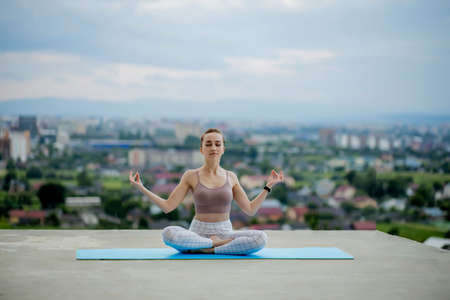 Yoga and meditation with big city on background. Young woman doing yoga on the roof.