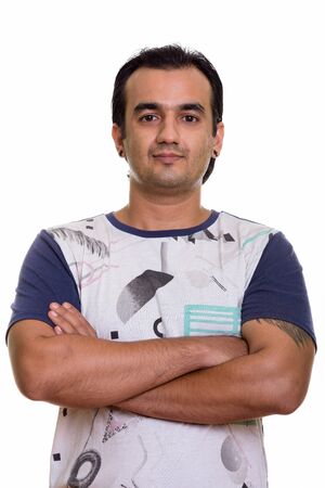 Portrait of mature bearded Indian man with curly hair wearing hoodie