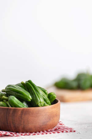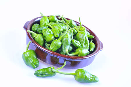 Padron peppers on wooden bowl and white background. Typical spanish food. Healthy food. Traditional Spanish green paprika.