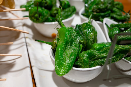 pimientos padron grilled spanish green chilli peppers tapas snack on plate in rustic santiago de compostela restaurant