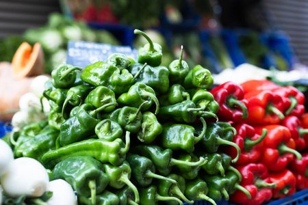 A bunch of green peppers are piled on top of each other. The peppers are all different sizes and shapes, but they all have a similar color. Concept of abundance and freshness