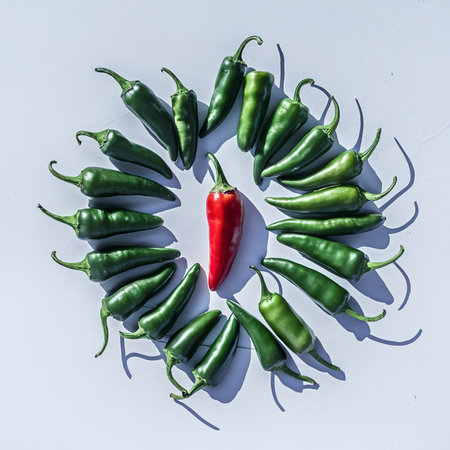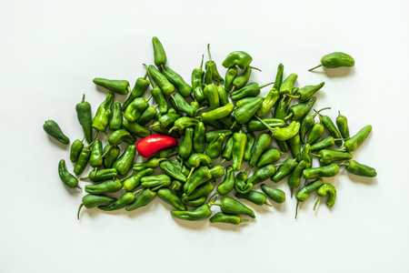 A bunch of green padrón peppers and a lone red one on smooth white surface