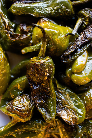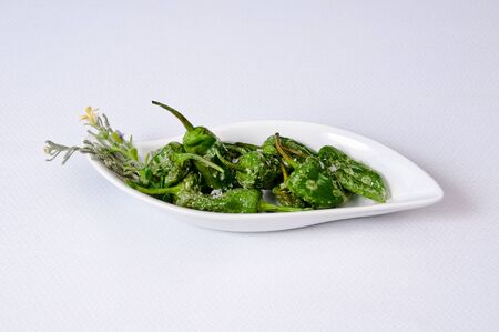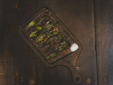 Fried and grilled padron peppers (Pimiento de padron, also known as pimiento de herbon) with sea salt. It is a famous Spanish tapas dish which originated from Galicia region.