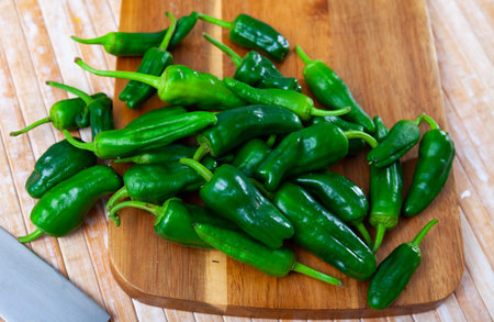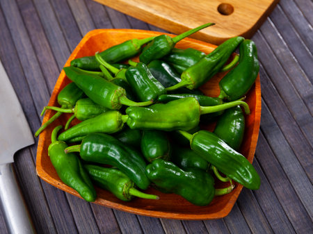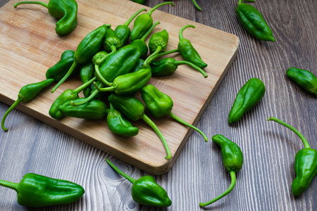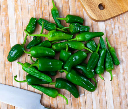 Food and drink, still life, moody concept. Raw green peppers pimientos de padron mexican jalapeno traditional spanish tapas on a wooden table. Selective focus