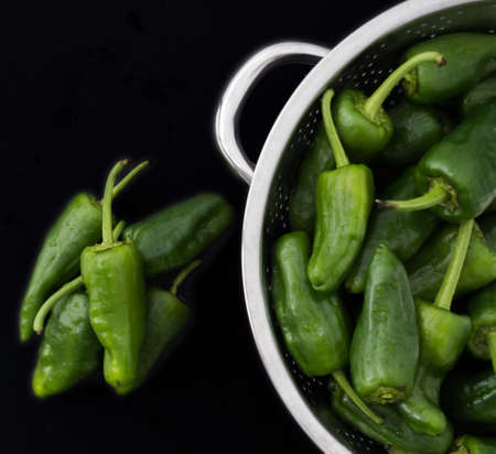 A pile of raw Padron peppers typical of Spain. Peppers in a colander on a black background. Flat lay. Top view.