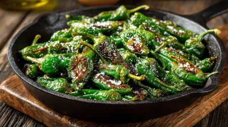 A plate of grilled shishito peppers sits in a cast iron skillet on a rustic wooden table. The peppers are charred and sprinkled with sea salt, perfect for sharing.