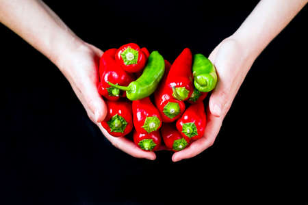 Juicy red hot peppers. Black background. Mediterranean diet. Generative AI.