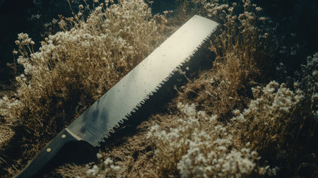 dramatic lighting on a handsaw blade surrounded by tall grass and blooming flowers --chaos 30 --ar 16:9 --v 6.1 Job ID: 2e91ad78-6804-4699-8832-ba72f5804e7d