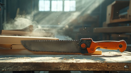A vintage woodworking scene capturing a rustic workshop table adorned with a saw and knife, surrounded by sawdust and warm natural light, evoking creativity.
