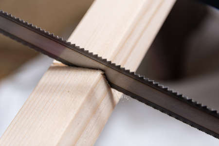 Hacksaw wooden planks on wood board construction concept.