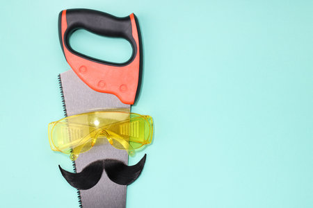 Man's face made of artificial mustache, safety glasses and hand saw on light blue background, top view. Space for text
