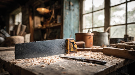 A beautifully arranged scene featuring a rustic serrated saw lying on a wooden workbench, surrounded by delicate wood shavings, capturing the essence of traditional woodworking.