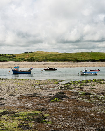 Clonakilty Bay at low tide on a cloudy day. A small blue fishing boat is anchored. Open seabed, silt and algae. picturesque seaside landscape.