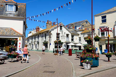 Padstow, Cornwall, UK - April 6th 2017: Cross Street, a quaint narrow road with sea view in the picturesque Cornish village of Padstow on a sunny day with blue sky