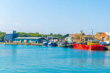 WEST BAY, UK - OCTOBER 10, 2022 - Fishing boats moored in the harbour with town buildings to the rear, West Bay, Dorset, UK, Europe, October, 2022.