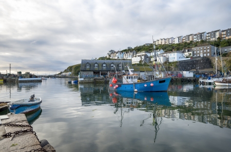 Boats on the sand at low tide in the harbour of New Quay, Wales (Ceredigion)