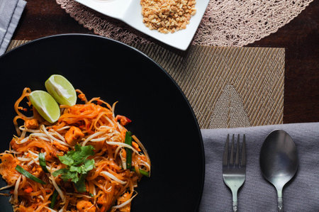 Thai Food Pad Thai (Thai national dish) Pad Thai on black plate with lime and seasonings.