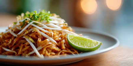 An inviting plate of Thai Pad Thai featuring fresh lime and bean sprouts, served amidst a lively dining scene with various colorful dishes.