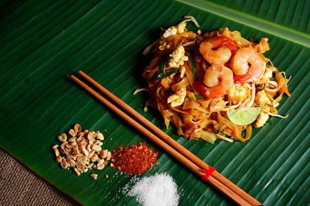A traditional Thai dish of Pad Thai noodles with shrimp, peanuts, and lime on a banana leaf plate.