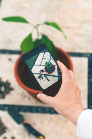Female hand makes photo of acocado palnt in a pot in the garden.
