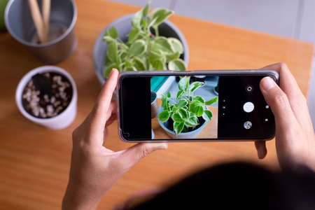 Hands woman taking a photo beautiful plant in pot with smartphone