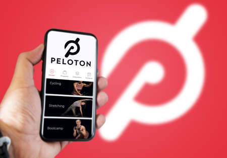 New York, USA, July 2021: A hand holding a phone with the Peloton app on the screen. Red background with blurred Peloton logo. Peloton is an American exercise equipment based in New York