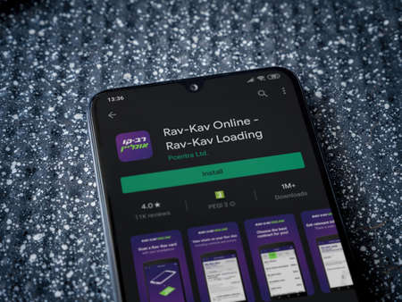 Lod, Israel - July 8, 2020: Rav Kav Online app play store page on the display of a black mobile smartphone on a metallic background. Close up top view flat lay.
