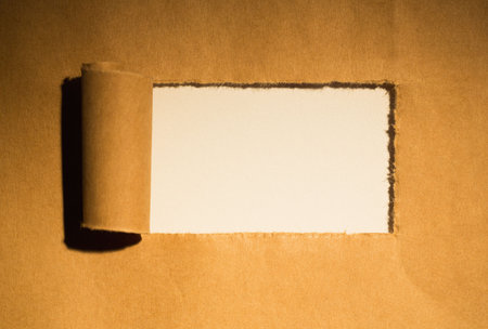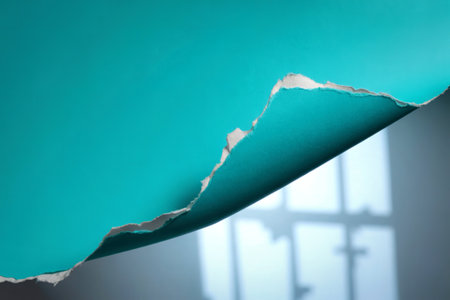A close-up shot of a torn edge of teal paper, revealing its white interior. The background features a blurred window with light casting shadows.