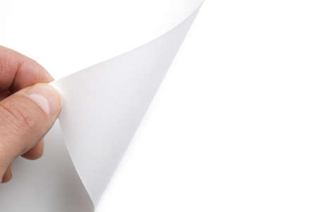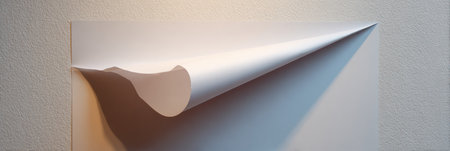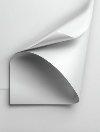 This image features a curled edge of white paper against a plain white background, creating a subtle shadow effect. The minimalist design is ideal for use in graphic design projects, presentations, or as a template for showcasing products or text. The clean and simple aesthetic makes it versatile for various applications.