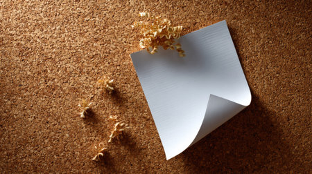 A blank sheet with curled corners pinned on a textured cork board, offering space for announcements or lists
