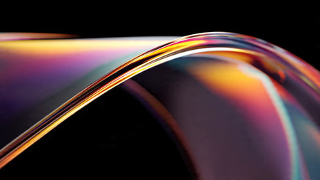 A stunning abstract image featuring a curved, iridescent shape with vibrant rainbow colors, set against a sleek black background, evoking a sense of dynamic movement and fluidity.