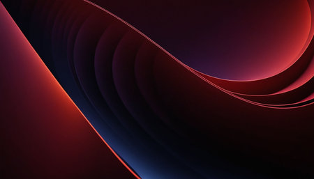 Dark abstract background featuring deep red and blue curved layers with subtle glowing orange and blue light accents.